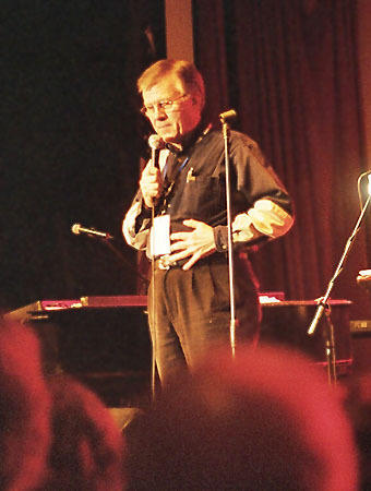 Moderator BOB HALE erzählt auf der Bühne des Surf Ballroom in Clear Lake Iowa im Jahr 1999 die Geschiche über das letzte Treffen mit dem Big Bopper, das er und seine Frau Kathy hatten im Februar 1959. Sie trafen sich für eine geraume Zeit.