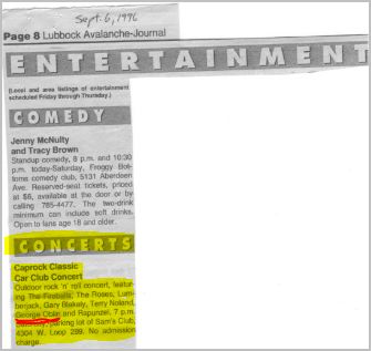 I just remembered further details about my performance in Lubbock on September 7, 1996. The show took place on an outdoor stage outside Sam's Warehouse.