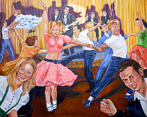 |  | | A very dynamic and colorful painting called 'ROCK AROUND WITH OLLIE VEE' by Bryan Bustard |