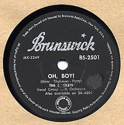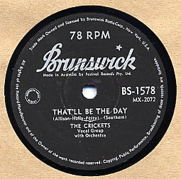 Wir setzen einfach noch einen drauf: Diese 78er Schellack wurde tatsächlich in Südafrika gefertigt und verkauft. Schon damals, in den Fünfzigern. Eigentlich fast unglaublich. Kurios ist es schon, wenn man die auf dem Kopf stehende Zahl zwischen 'THE CRICKETS' und 'Southern Music Pub. Co.' sieht. Ungewöhnlich.