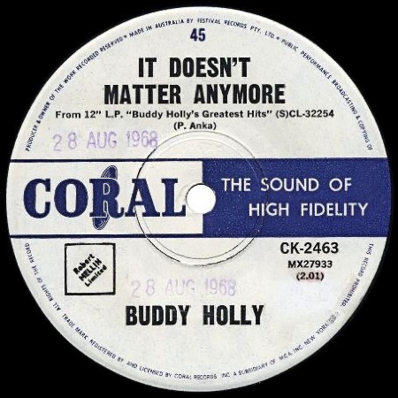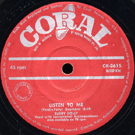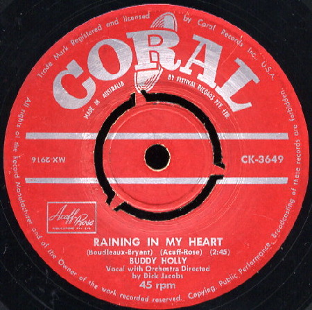 I have only started collecting 45 singles from Australia in recent times. My collection of these is very limited. The foremost collector of Australian releases is Roddy Jordan from Victoria, Australia. I highly recommend his book Buddy Holly & The Crickets Musical History In Australia which contains a superb pictorial discography of all the Australian releases and variations.