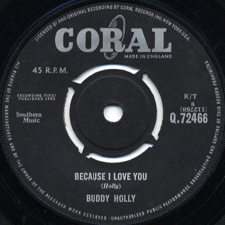 BECAUSE I LOVE YOU von Buddy Holly auf einer in England produzierten, aber in Dänemark verkauften 45er Vinyl.